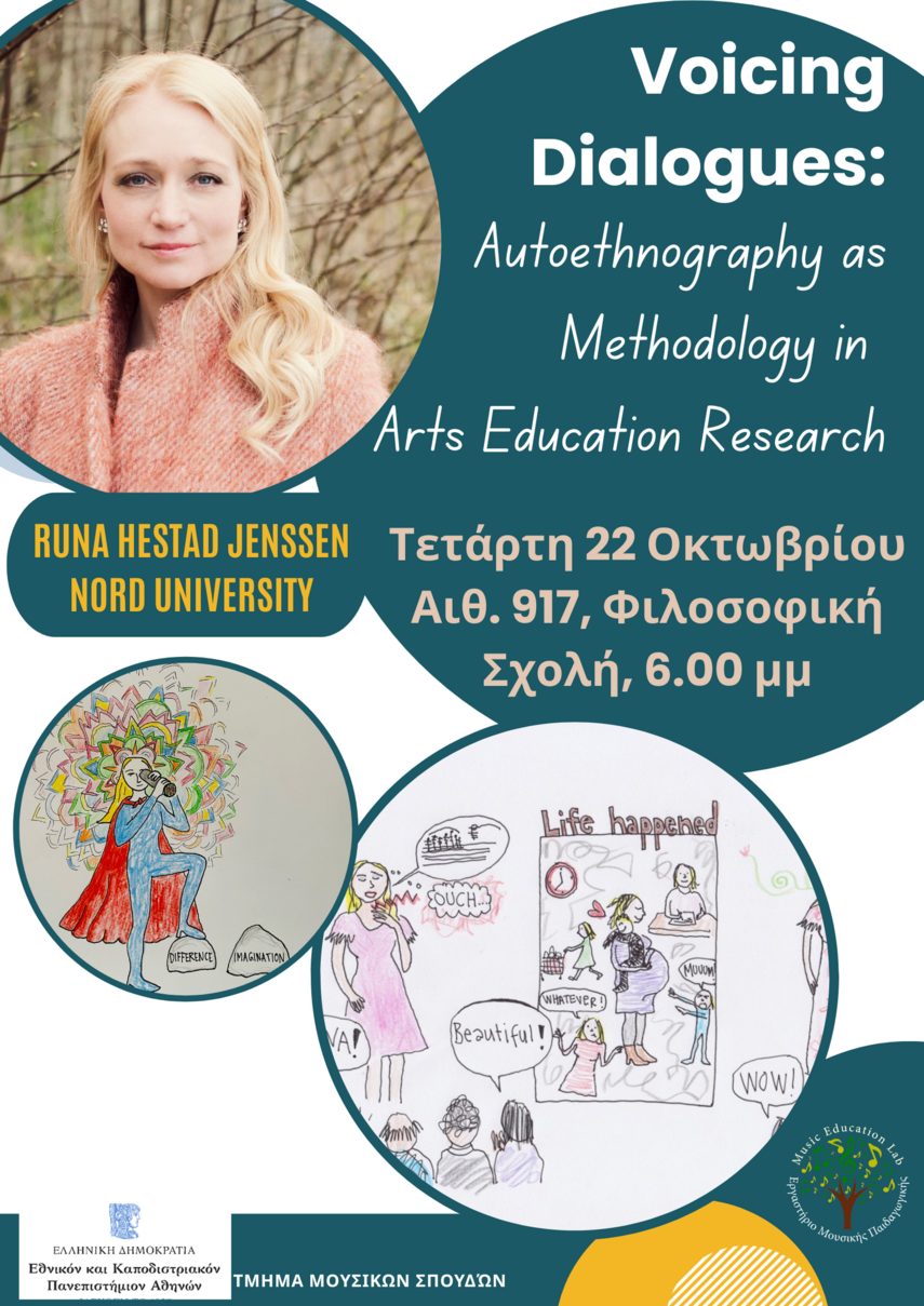 Με πρωτοβουλία του Εργαστηρίου Μουσικής Παιδαγωγικής και την υποστήριξη του Τμήματος Μουσικών Σπουδών, την Τετάρτη 22 Οκτωβρίου, στις 18.00, στην αίθουσα 917, θα πραγματοποιηθεί διάλεξη της Αναπληρώτριας Καθηγήτριας Runa Hestad Jenssen από το Nord University της Νορβηγίας, με τίτλο "Voicing Dialogues: Autoethnography as Methodology in Arts Education Research".